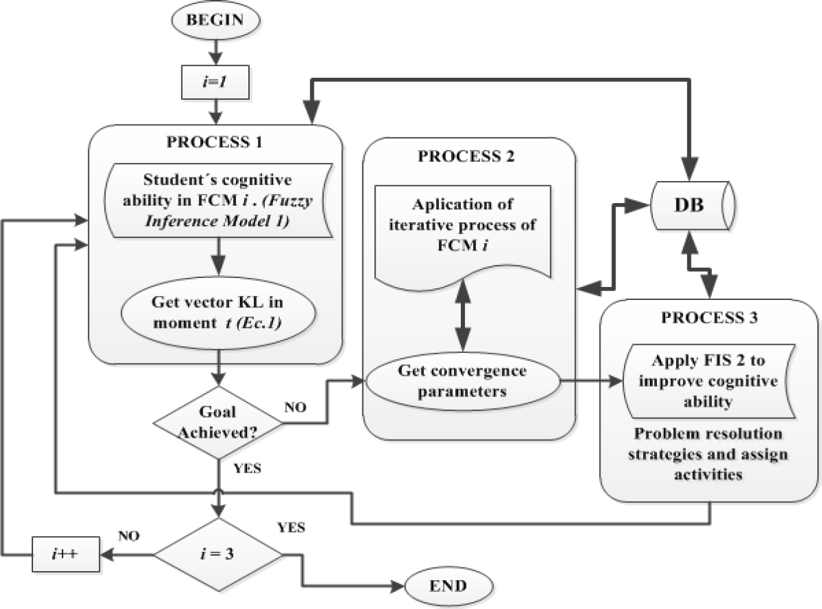 Rongmei propose an analytical model, combined with fuzzy logic to categorize somehow students based on their cognitive ability and propose a model that is able to make the appropriate instructional design decision to the student, based on their progress. This model is the one that is being implemented in the part of the detection of the student´s cognitive ability in problem solve, of the proposal of this paper. The evaluation model can be expressed via a triple, such as formula 6 [25]: