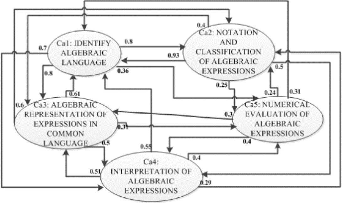 Formally, using the elements described in section 2.1.2 of this paper, the set C for the cognitive map of algebra, which we denote by Ca is defined as: