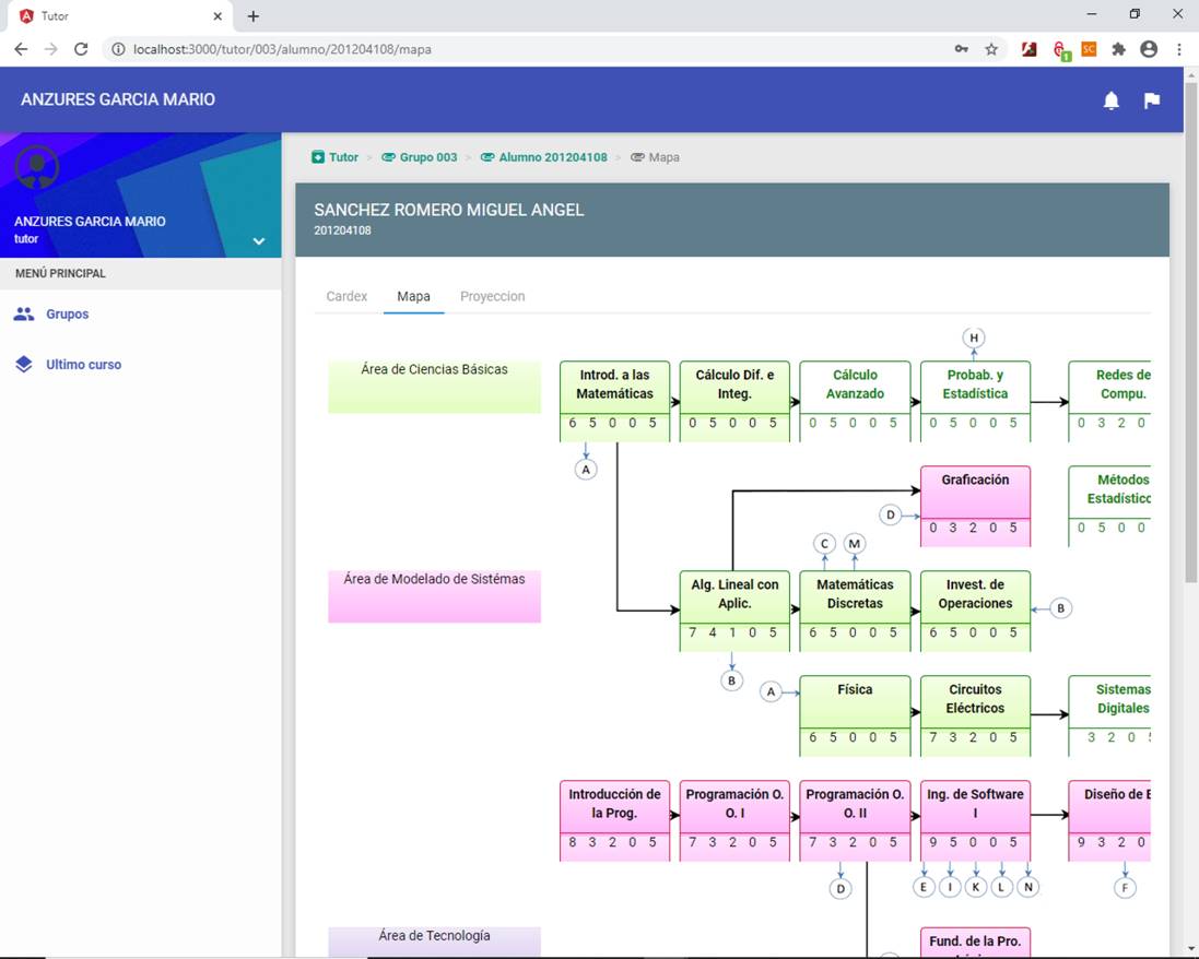 The tutor user interface (see Figure 3) shows its name, two options: groups, and lasts courses, by default the information of its group is presented. For each group a student’s list collected by pages is displayed. In order to the tutor guides and orients to students in a better manner, the first can consult the list of approved subjects in the last period by each student.
