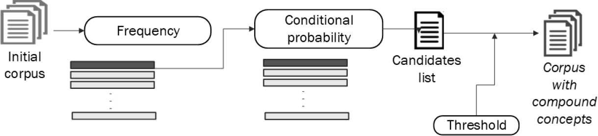 Figure 3 shows experimental process for the experiments. It consists of two steps, each of them gets a threshold; first through the frequency and then through the conditional probability. Two steps were implemented due to there are three-words collocations, then, first a two-words collocations were obtained, afterwards, these collocations were analyzed with its neighbors.