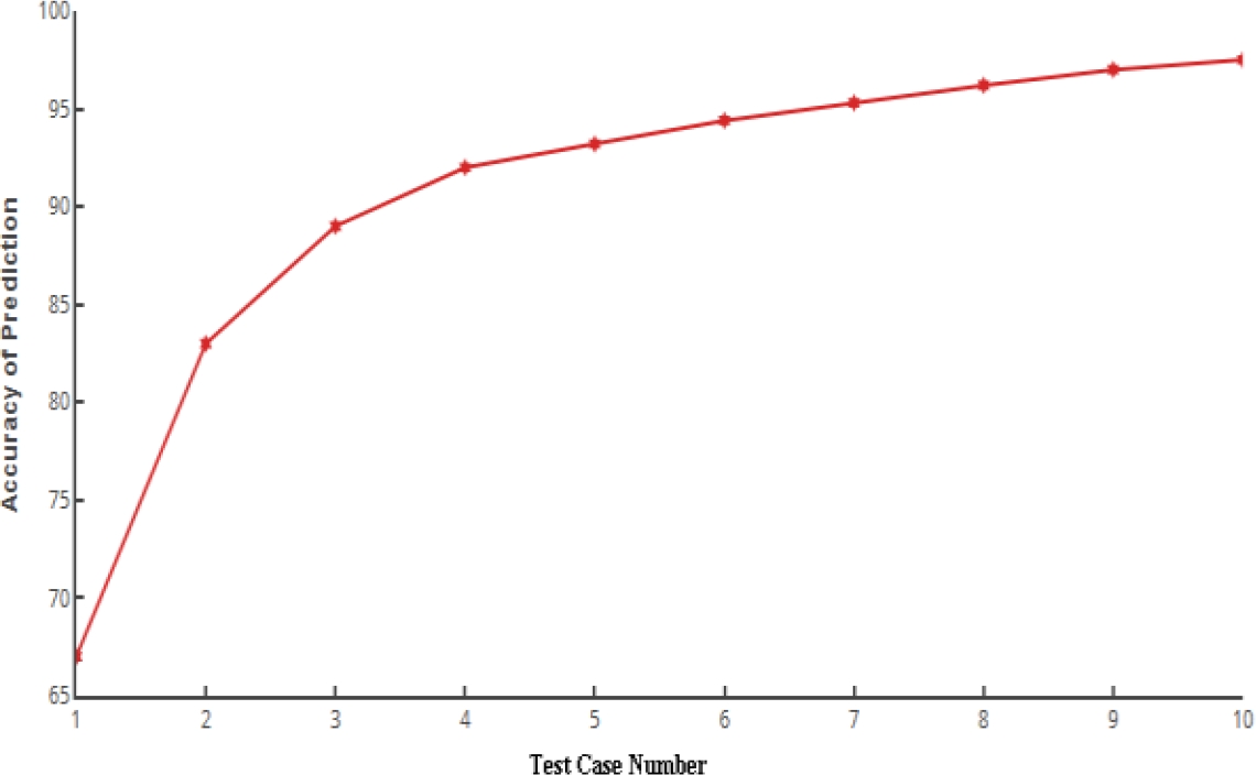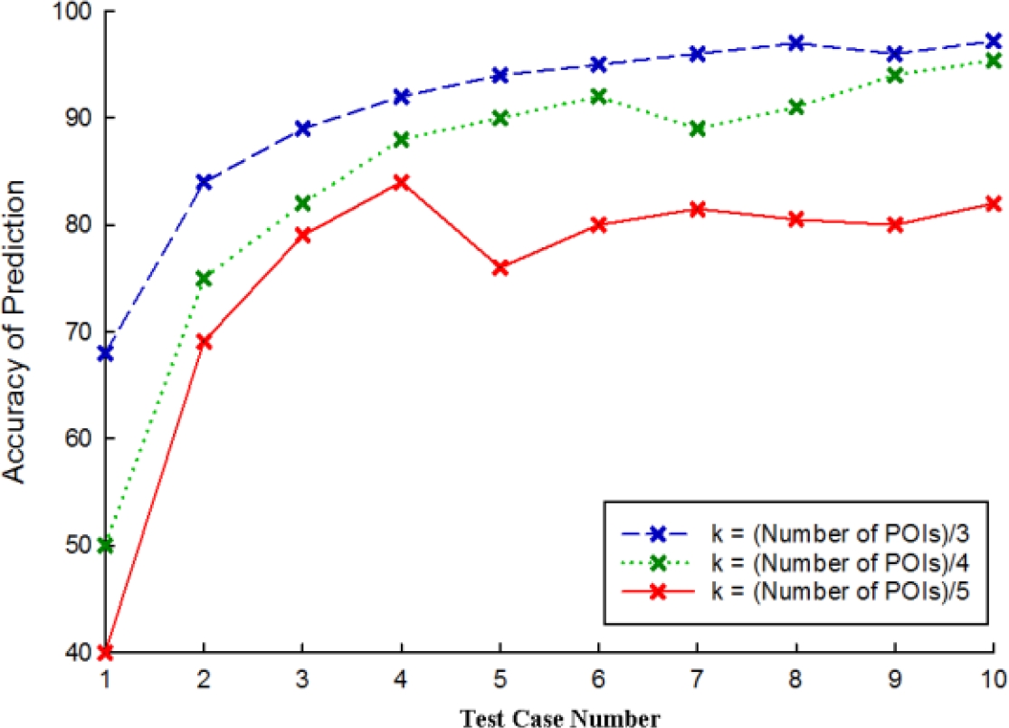 Figure 2 shows the accuracy of prediction for 10 test cases. In the figure, the X-axis represents the test case number. The Y axis represents the accuracy of prediction for each test case. From this figure, it is evident that the accuracy of the enhanced scheme for next location prediction ranges from 67% to 97%.