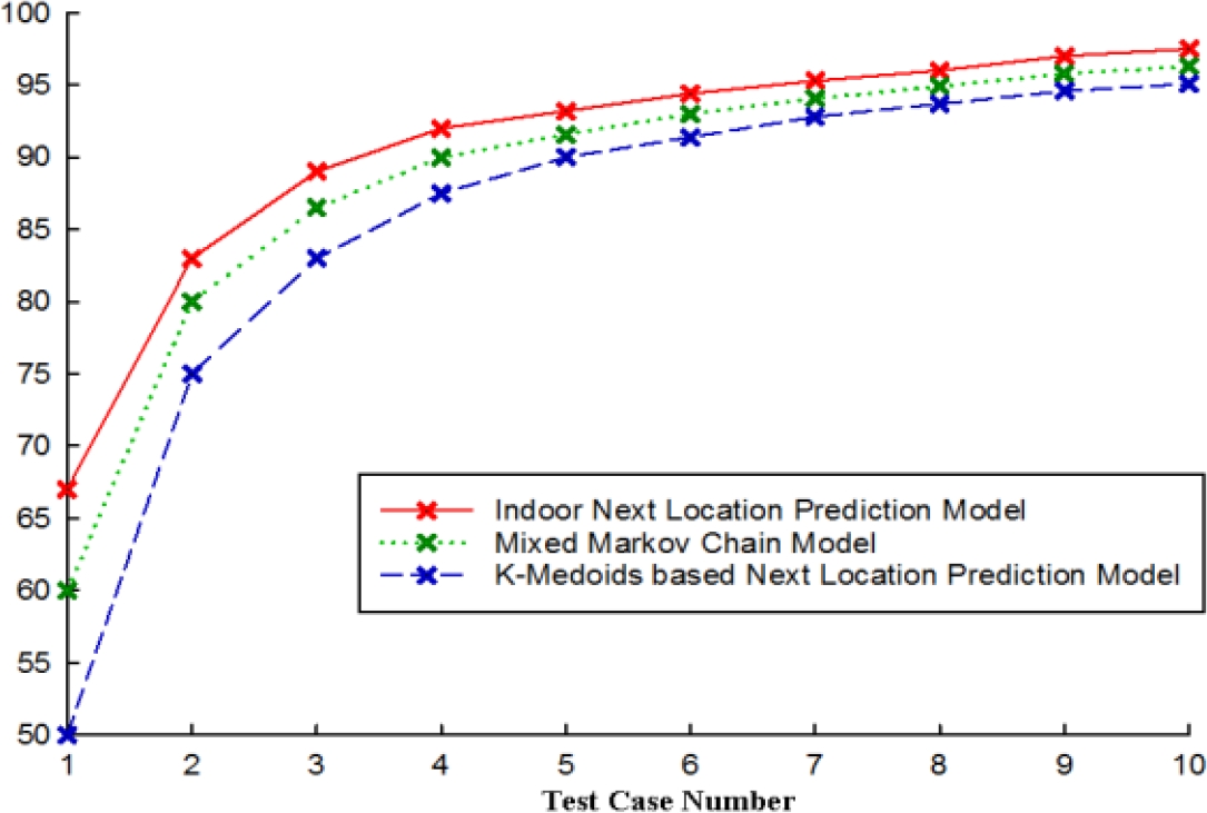 The figure indicates that the proposed enhanced K-Medoids based Next Location model achieves higher accuracy than that of both the existing schemes. In the Indoor Next Location Prediction Model, only one location is predicted as the next location of the user.