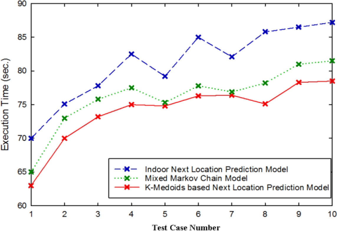 Figure 4 shows a comparison of the proposed scheme with indoor next location prediction model and mixed Markov chain model considering the execution time. It can be observed from the figure that the enhanced K-Medoids clustering based next location prediction model requires less execution time compared to the existing schemes.