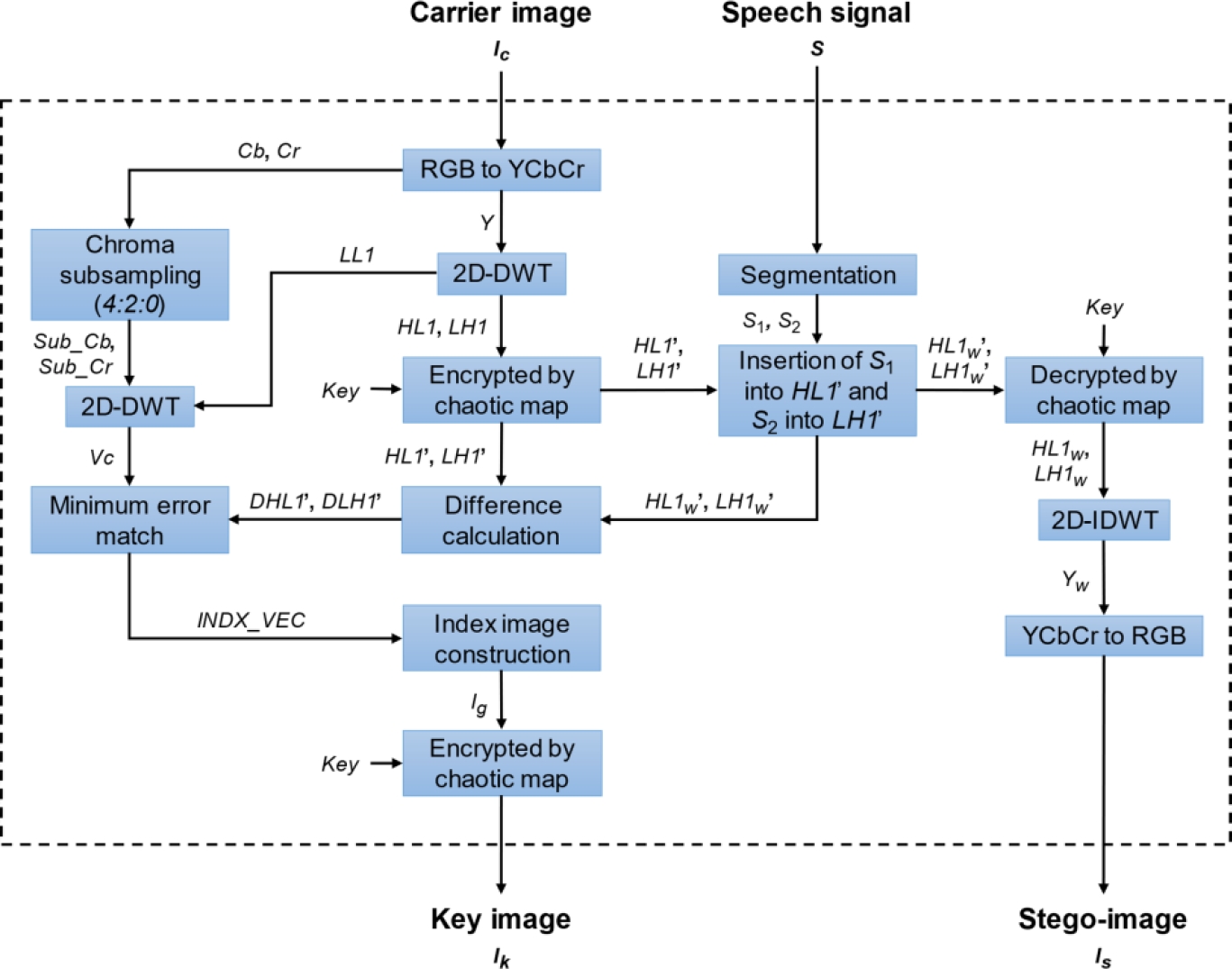 Punidha et al. [8], described a scheme based on the integer wavelet transform (IWT) and the YCbCr color space. For the embedding process, the secret message is generated using the approximation coefficients of the first level IWT of the speech signal and it is embedded into the LL1 subband of the first level IWT decomposition of the Cb channel. During the extraction process, only the stego-image is required, however, only the Cb channel is used for hiding in order to maintain the visual quality of the stego-image, resulting in limited embedding capacity of this method.