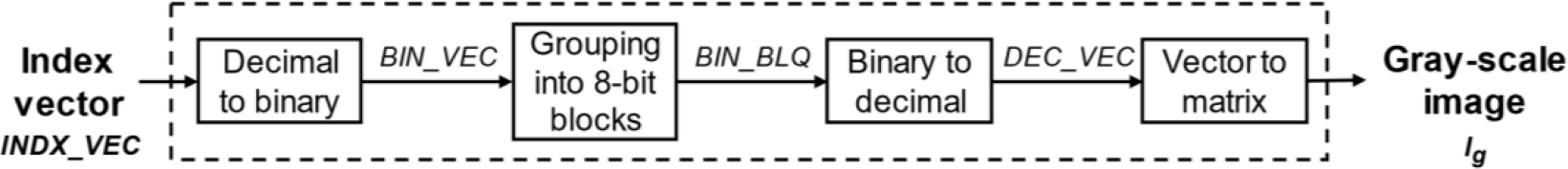 The obtained indexes INDX_VEC are normalized to a range of values between 0 and 255 to construct a grayscale image, which is encrypted using the sine chaotic map. Figure 2 shows the normalization process of the indexes. As can be seen, a matrix is performed from the normalized indexes vector. The dimensions of this matrix are established from the maximum information capacity that can be embedded and the necessary number of bits to represent the largest index of Vc. For example, for a 512×512 image, it is possible to hide up to 131,072 audio samples and 18 bits are required to represent the largest index of Vc; therefore, there are 294,912 normalized values in the range of 0 to 255. Thus, the matrix should be dimensioned using the following equation: