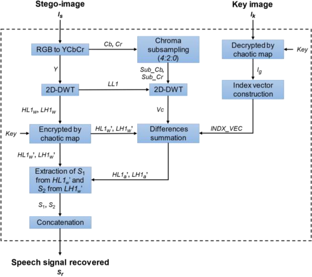 The speech signal recovery process requires the stego-image and the key image. Figure 3 explains the procedures required to extract and reconstruct the speech signal. Firstly, the stego-image is transformed to the YCbCr color space using (1)-(3); then, the Y channel is divided into the LL1, HL1w, LH1w and HH1 subbands derived from the first-level DWT decomposition. HL1w and LH1w contain the secret message, however, it is necessary to encrypt this subbands by the sine chaotic map before starting extraction.