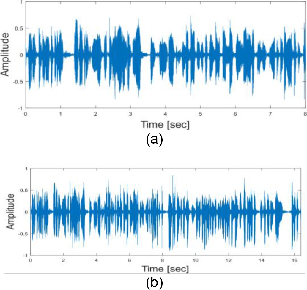 Figure 5 shows two speech signals with different recording times used as secret messages. It is important to mention that the speech signal shown in figure 5(b) allows to embed the maximum possible information capacity into the carrier images.