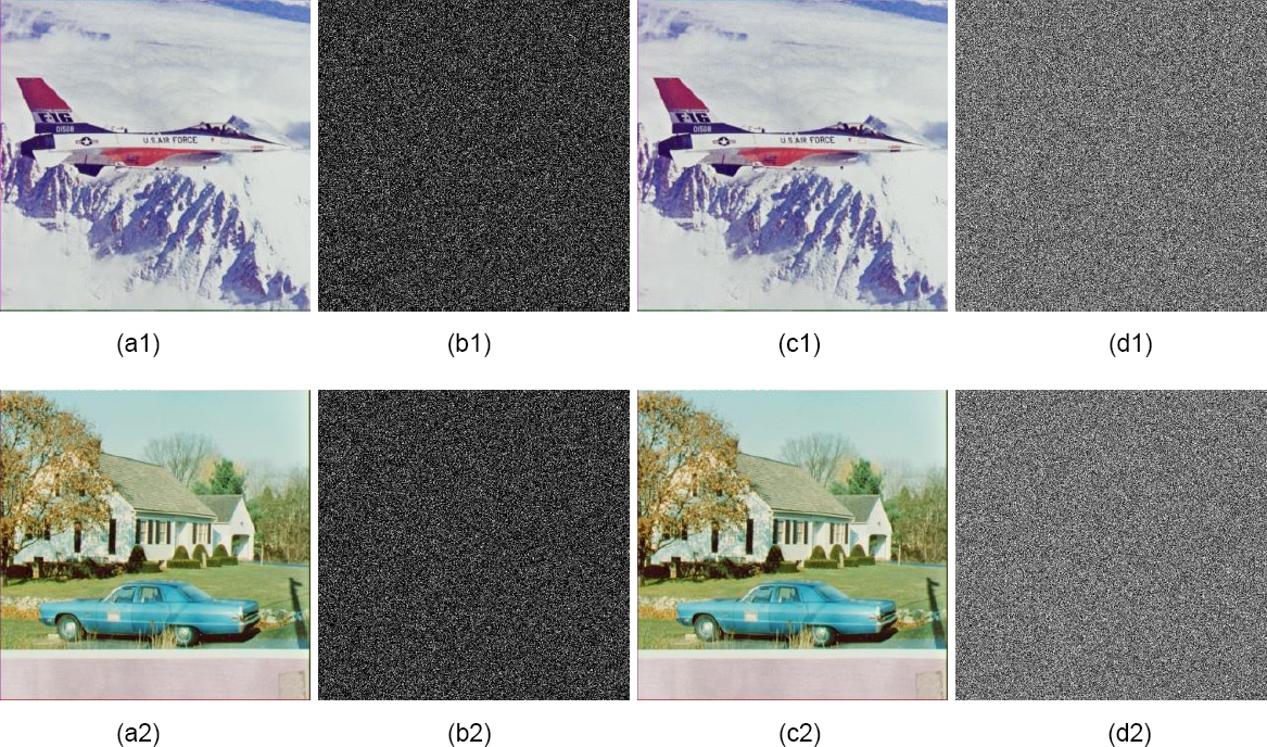 Fig. 6 Stego-images and key images obtained from the embedded process for two different speech signals: (a1, a2) Stego-images and (b1, b2) Key images with 8 sec embedded speech signal; (c1, c2) Stego-images and (d1, d2) Key images with 16.384 sec embedded speech signal
