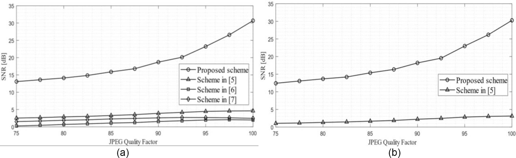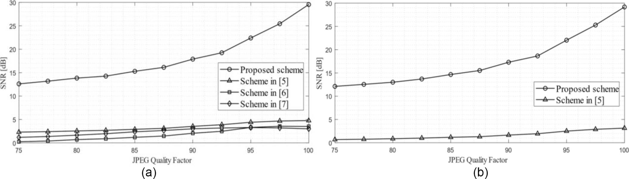 Figure 9 shows a performance comparison between the proposed scheme and state-of-the-art methods, regarding to the recovered speech signals audio quality for different recording times from 2 to 16 seconds. As it can be noticed in experimental results, the proposed scheme appears to demonstrate an outstanding performance compared with state-of-the-art schemes in terms of imperceptibility for the secret message, excellent visual quality of the stego-image, improved embedding capacity, higher robustness against JPEG compression and superior audio quality of the recovered speech signal.