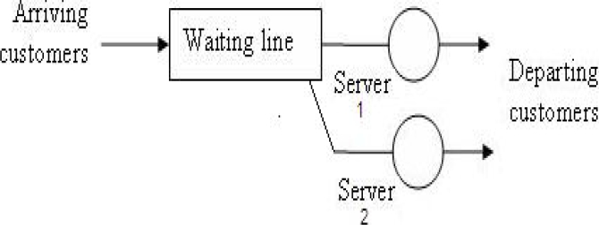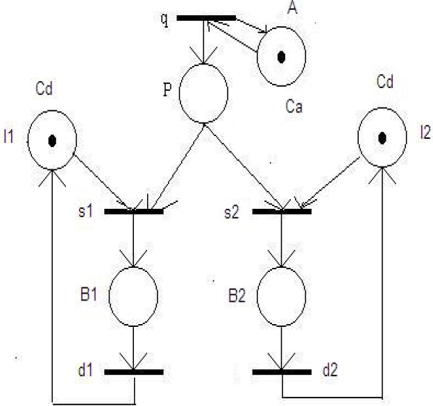 Consider a two server queuing system (Fig 1.) whose timed Petri net model is depicted in Fig 2. Where the events (transitions) that drive the system are: q: customers arrive to the queue, s1, s2: service starts, d1,d2: the customer departs. The places (that represent the states of the queue) are: A: customers arriving, P: the customers are waiting for service in the queue, B1, B2: the customer is being served, I1, I2: the servers are idle. The holding times associated to the places A and I1, I2 are Ca and Cd respectively, (with Ca > Cd).
