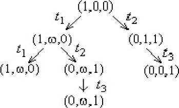 The reachability tree of the Petri net, starting from the initial marking (1, 0, 0) is shown in >Fig 4.