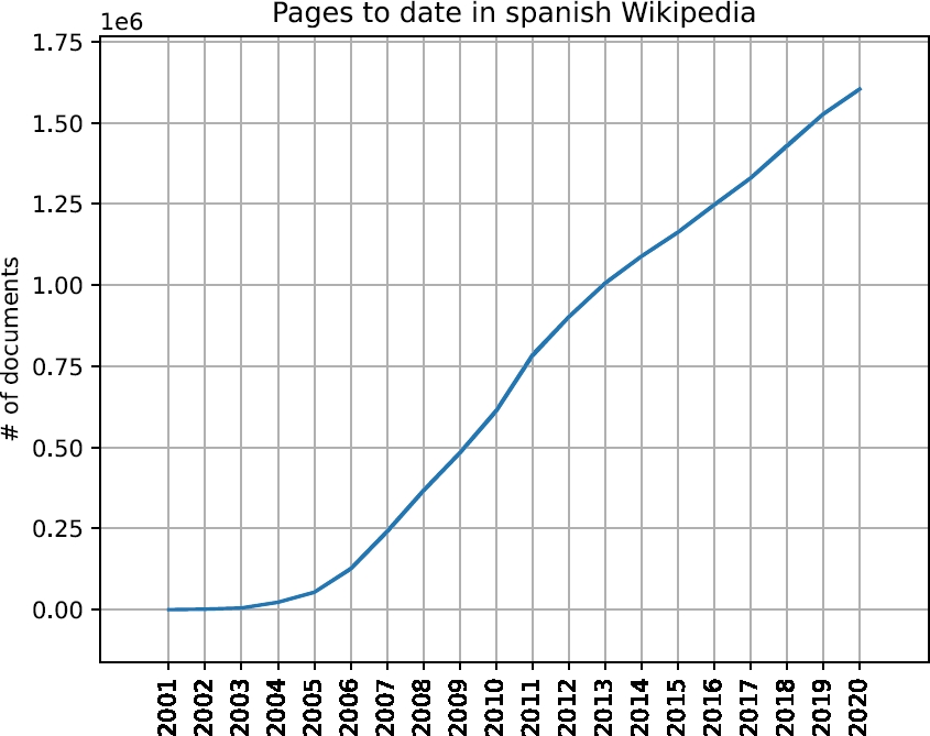Wikipedia in Spanish gathers a total of 1,636,082 articles, annexes and categories, ranking it in ninth place in Wikipedias based on the total content pages. Figure 2 shows the amount of articles in the Spanish Wikipedia over the years.