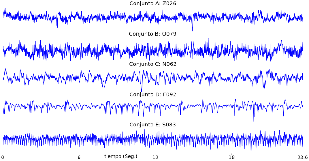 Todos estos segmentos EEG se registraron con un amplificador de 128 canales, un convertidor analógico-digital de 12 bits a una frecuencia de muestreo de 173,61 Hz, y se les aplico un filtro pasabanda con ajustes de 0,53 Hz y 40 Hz [3]. El número de registros en total es 500, con 4097 muestras cada uno. La Figura 1 presenta una muestra de cada una de las cinco señales por cada conjunto, la unidad de los ejes verticales esta en micro voltios (μV).
