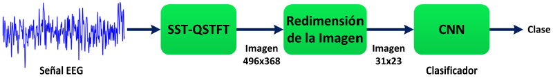 El diagrama de bloques general para la clasificación de la señales EEG se muestra en la Figura 2. La señal EEG sin pre-procesar entra al bloque que calcula su SST-QSTFT y genera una imagen, a escala de grises con dicha representación, de 496 pixeles de ancho y 368 pixeles de alto, luego esta imagen se reescala a 31 pixeles de ancho y 23 pixeles de alto, que finalmente entre a la red neuronal convolucional (CNN), que clasifica la señal en una de las tres clases definidas anteriormente.