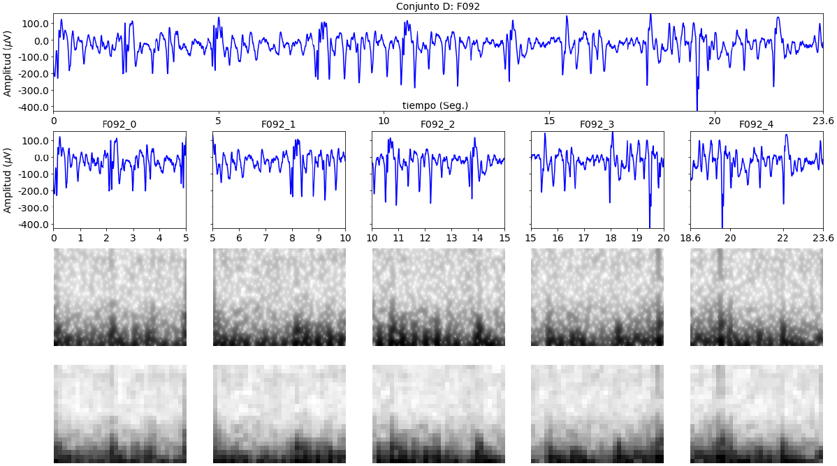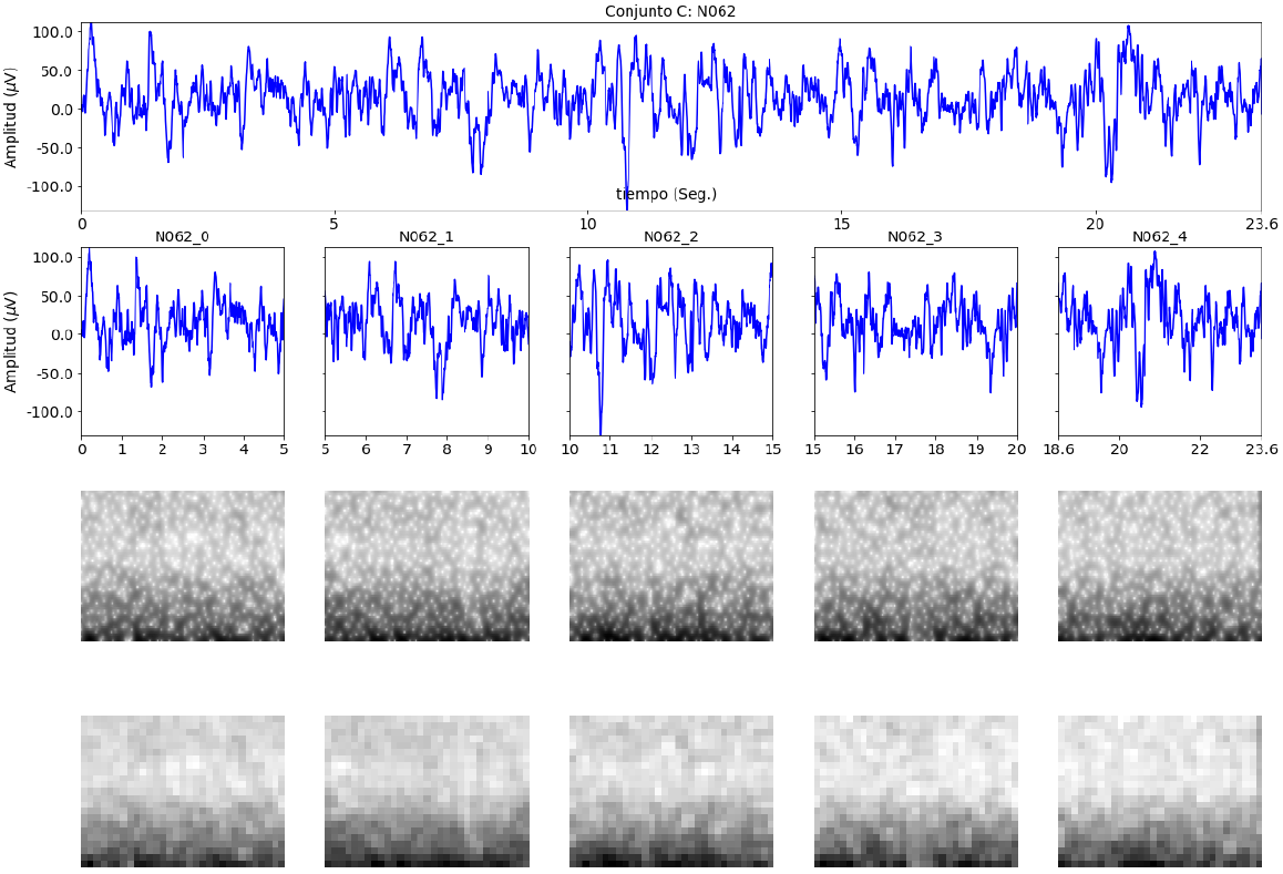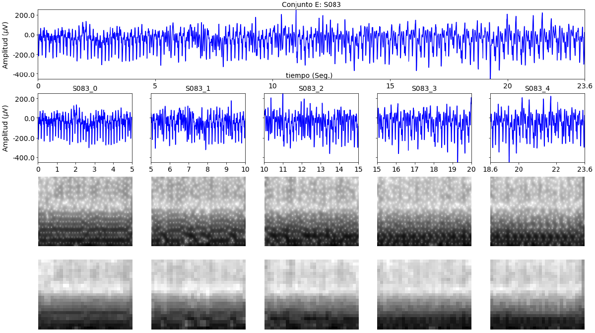 Para aumentar el conjunto de entrenamiento se segmentaron las señales en cinco segmentos de 5 segundos; los cuatro primeros segmentos no están solapados, y el quinto segmento se solapa con el cuarto segmento en un 28% (entre los segundos 18,6 y 20). Las figuras 4, 5, 6, 7 y 8 muestran las señales Z006, O079, N062, F092 y S083, correspondientes a las señales de de los conjuntos A, B, C, D y E (ver la Figura 1), segmentadas y con su correspondiente transformada SST-QSTFT.