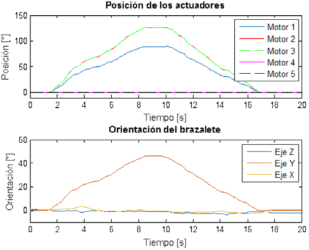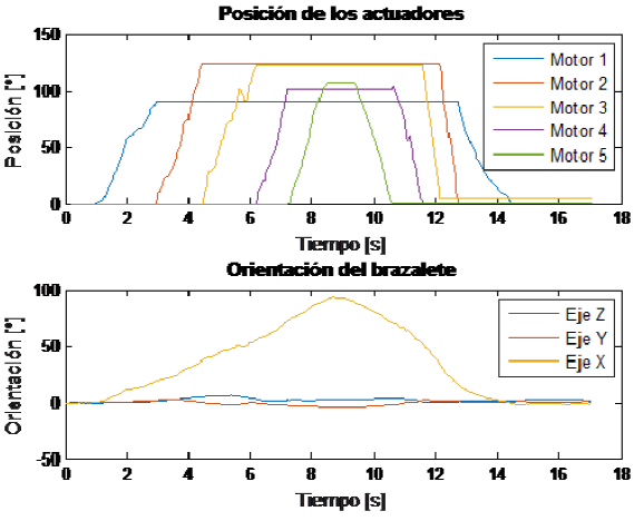 En la parte inferior de la Fig. 11 se muestra la orientación del eje x llegando a 100 aproximadamente como máximo. Een la parte superior de la misma figura se observa como los actuadores correspondientes a los cinco dedos se mueven de manera sucesiva en función del cambio en la orientación del brazo alrededor del eje x. Los resultados de esta prueba se pueden observar en el video disponible en youtube6.
