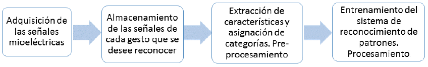 El sistema funciona leyendo las señales electromiográficas tomadas del antebrazo mientras se realiza cada uno de los gestos que se desee detectar. En este caso se reconocerán 6: movimiento de palma izquierda y derecha, puno, mano abierta, descanso y un gesto propuesto.