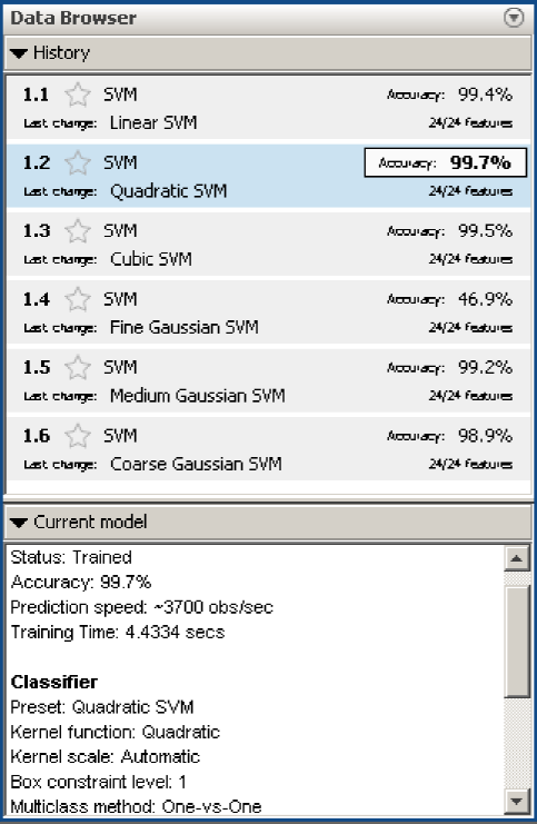 Posteriormente se utiliza una máquina de soporte vectorial (SVM, por sus siglas en ingles) [1,2] para hacer la clasificación y el entrenamiento de los distintos núcleos, seleccionando el tipo específico como el Medium Gaussian, quadratic, cubic, etc. con base en restricciones que se dan por factores como el porcentaje de grasa en la piel, vello corporal o humedad. Por la información utilizada en este trabajo, el núcleo con mejor desempeño fue Quadratic SVM, el cual tuvo una precisión de 99.7 por ciento (Fig. 4).