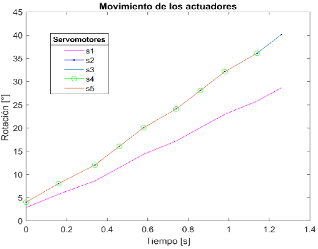 En la Fig. 6 se muestra la gráfica de rotación de cada motor con respecto al tiempo mientras se realiza el movimiento de cerrar el puno a partir de la mano completamente extendida. Aquí, los motores se mueven al mismo tiempo y el mismo número de grados, excepto que s4 y s5 que se detienen antes, y s1 gira un menor número de grados.