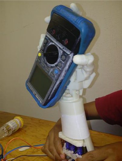 En la Fig. 8 se tiene la mano sosteniendo un multímetro para demostrar su capacidad de agarre y sujeción. Para visualizar el movimiento de la mano robótica con base en las señales EMG adquiridas, se puede consultar el video que se encuentra disponible4.