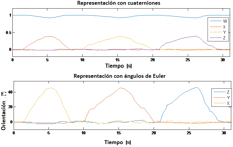 Además de las señales EMG, las mediciones de la orientación del brazalete, pueden ser también utilizadas como señales de control. En la Fig. 9, se muestran cuaterniones obtenidos de la pulsera MYO® así como las señales representadas por los ángulos de Euler.
