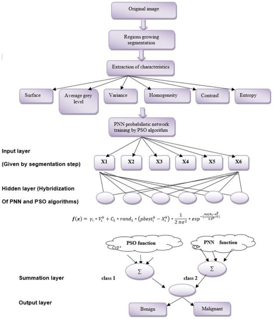 In this paper, we proposed a novel approach for the detection, analysis, and classification of microcalcifications on mammograms. The proposed approach is based on segmentation steps by region growing, extraction of the characteristic step by a PSO algorithm, and a classification step by using PNNs.