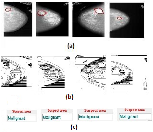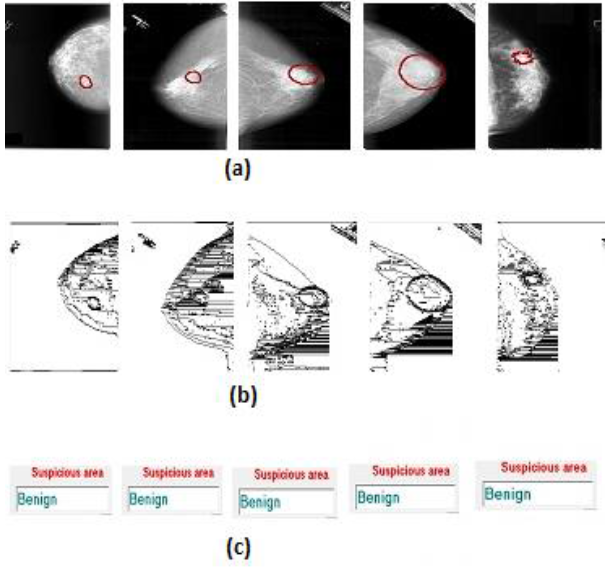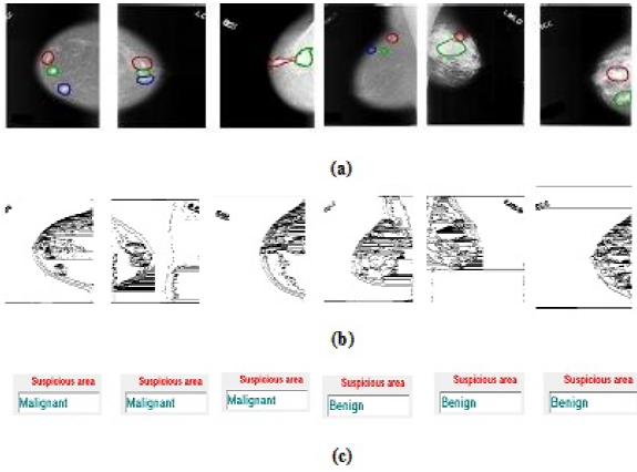 Fig. 5 (a) Original images with several suspicious areas, (b) segmented images, and (c) result of analysis.