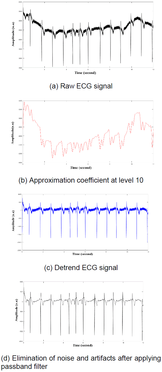 The 10th level approximation coefficient has been removed to eliminate the unwanted trend. The detrending of the raw ECG signal has been illustrated in figure (2c). Again, for removing noise and artifacts from the detrend ECG signals, a passband filter with a cut-off frequency of 5 Hz and 15 Hz were utilized. The elimination of noise and artifacts from the detrend ECG signal has represented in figure (2d).