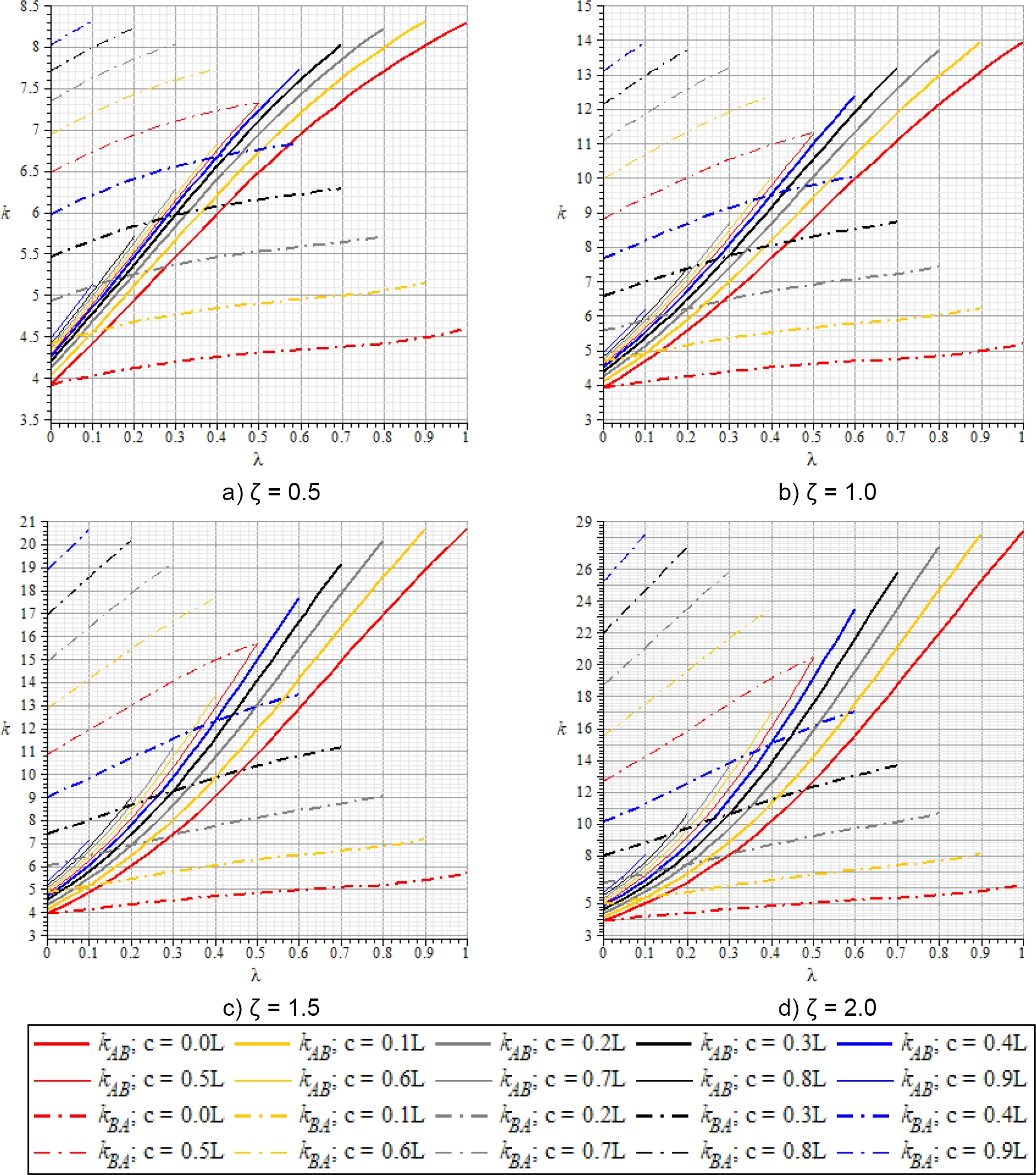Las ayudas de diseño para factores de transporte se obtienen a partir de las ecuaciones (5) y (6) tomando en cuenta u = s = ζh = 0.5L, 1.0L, 1.5L, 2.0L; a = λL; c = 𝜅L = 0.0L, 0.1L, 0.2L, 0.3L, 0.4L, 0.5L, 0.6L, 0.7L, 0.8L, 0.9L; h = 0.1L; ν = 0.20 para concreto [24]. Para c = 0L se considera u = ζh; s = 0.