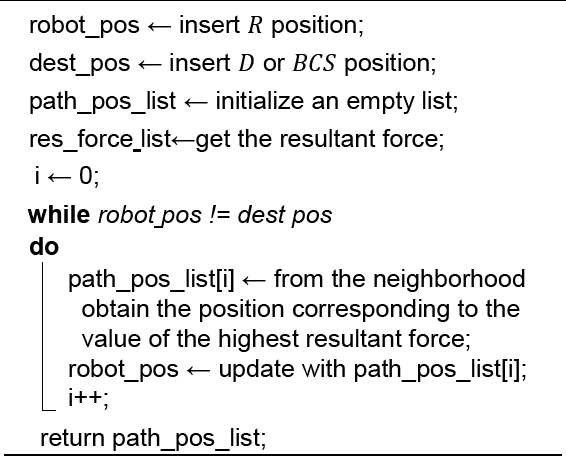Algorithm 2 shows the procedure followed to generate a path, where the entries are the R position and the D's position. This algorithm runs twice at starting to generate a path for going to the D and going to the 𝐵𝐶𝑆.