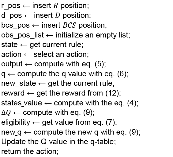 The method starts with a table of q values equal to zero. The update of the q-values occupies the reward function defined in equation (12):