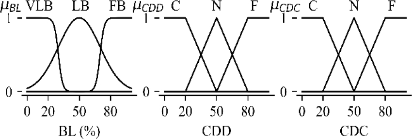 In the same way that FIS uses membership functions (MF), this architecture occupies the MFs shown in Figure 2. The MF of the BL input has three fuzzy sets that correspond to the level of the battery full (FB), low (LB), and very low (VLB); the MFs of the CDD and CDC inputs have fuzzy sets far (F), near (N), and very near (C).