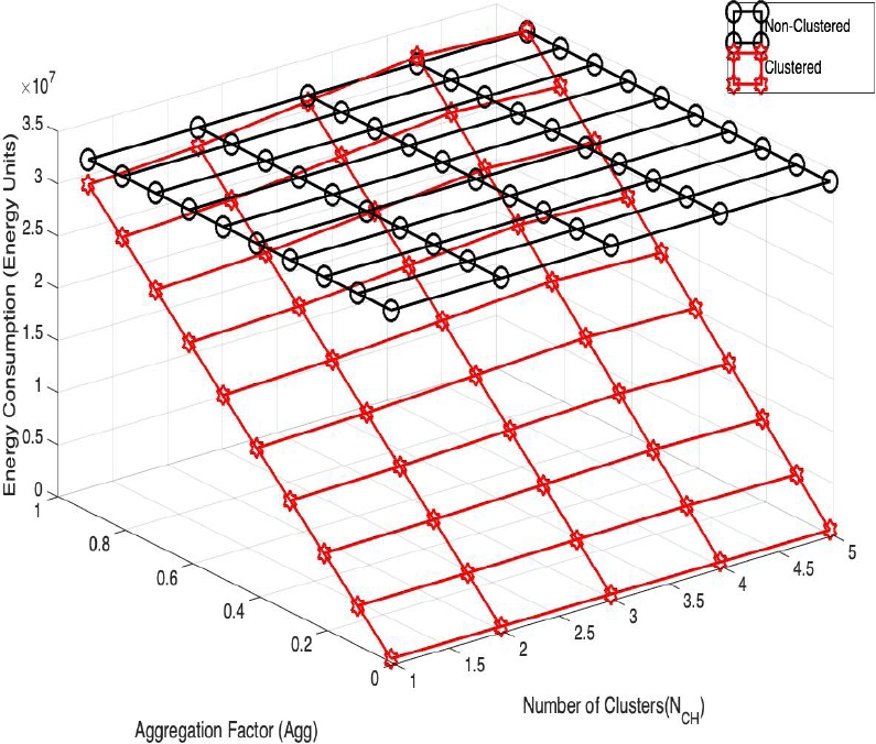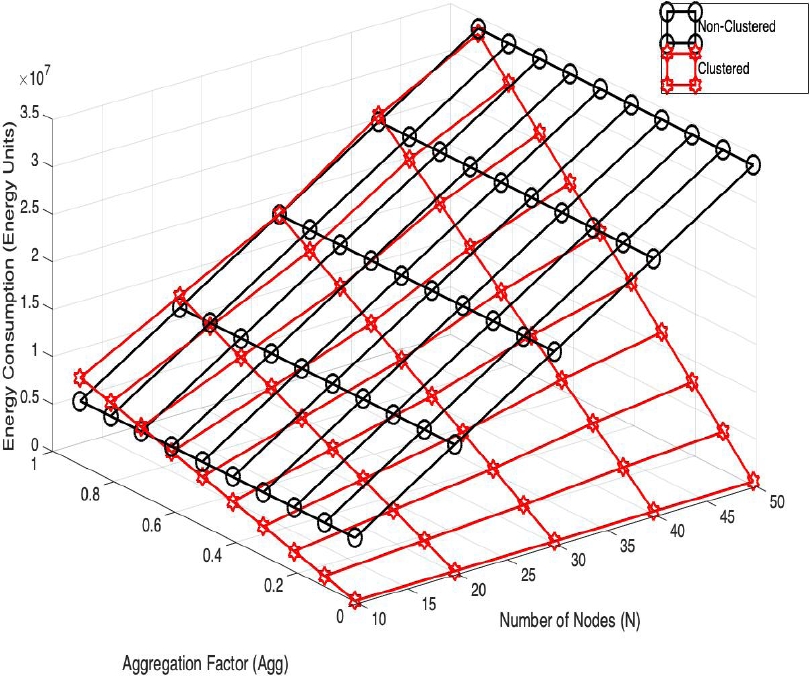 Now, the energy consumption per frame for different number of nodes, aggregation factor, and the number of clusters is shown in Figs. 1 and 2 respectively. For the later, the number of nodes is xed to 50, and for the former, the number of clusters is xed to 3. From these results, it is clear that as the aggregation factor decreases (high amount of aggregation or compression), the energy consumption decreases drastically in the clustered architecture. However, when no aggregation or compression is used, i.e., the cluster heads send all the complete packets of their cluster members to the sink, the energy consumption is very close, or even higher than the non-clustered network. And the highest amount of energy reduction occurs for high aggregation factors, which led us to believe that the benefits of clustering are the possibility to perform aggregation or compression but not the clustering per se.
