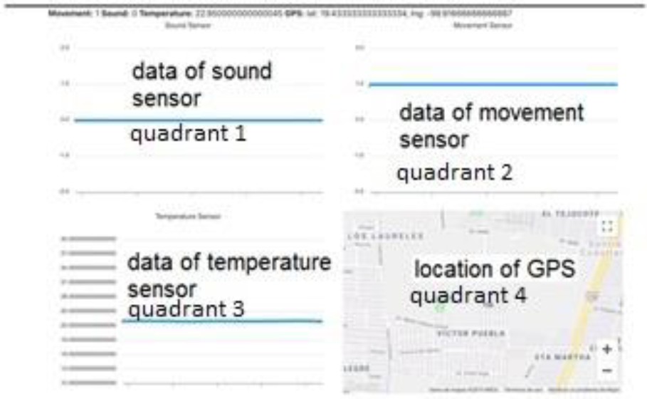 The information of each sensor is delivered in JSON format. This format is used by many standards for interchange of information using APIs. It is thus very popular. This format defines an object that contains two elements: key - value that each sensor sends. This data structure of the message received by each sensor is: {“sound”: 0, “longitude”: “-”, “temp_amb”: 2169000000000 0055, “obj_amb”: 12.270000000000039, “latitude”: “-”, “speed”: “-”, “movement”:0}.