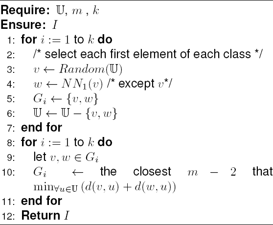 4. C2e selects, for each class, a pair of mutual nearest neighbors and the m2m − 2 permutants that minimize the sum of distances to the previous ones in the class. See Algorithm 2.