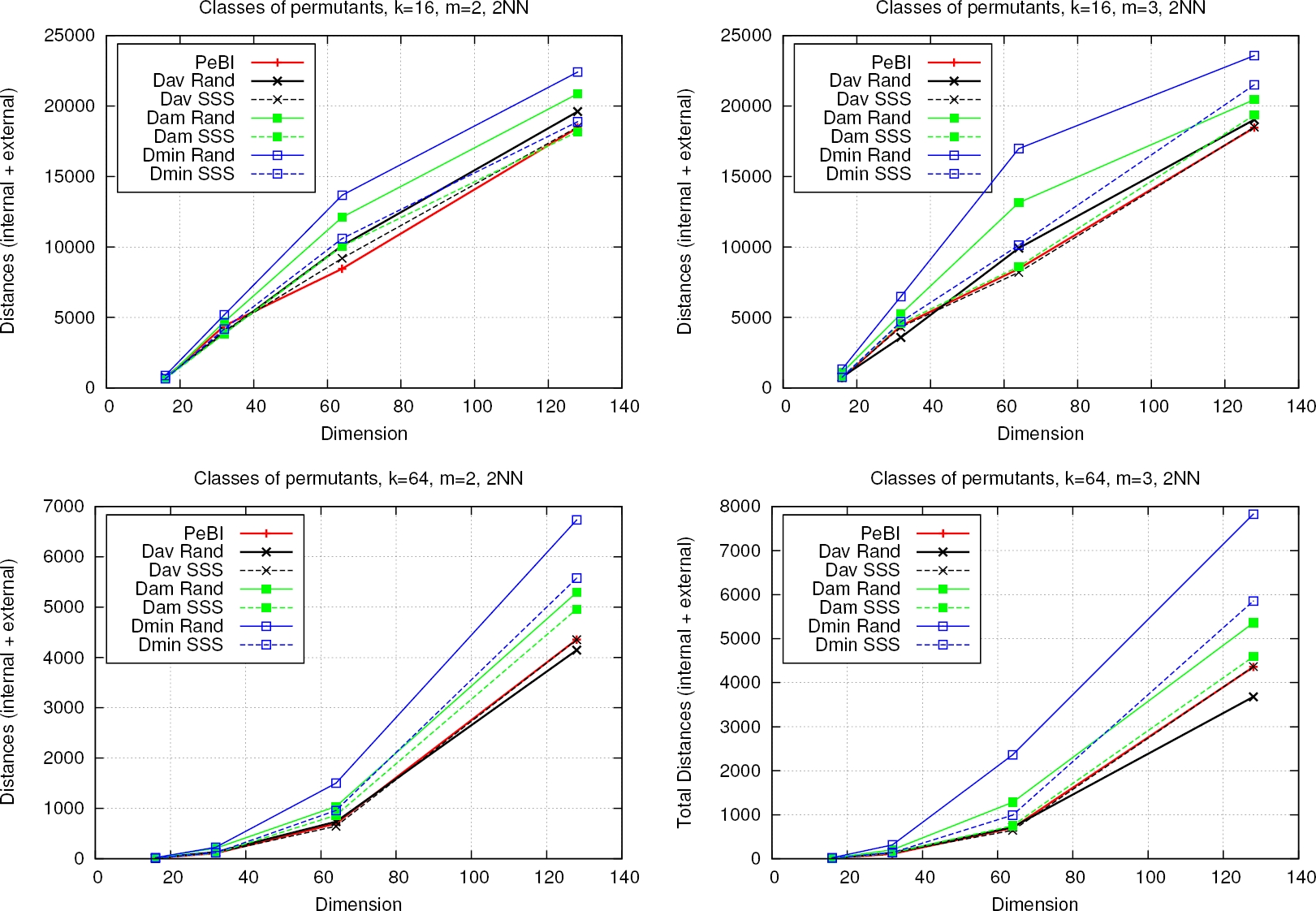 In Figure 3 the performance of our technique as the dimension increases is showed. As we expected, the number of distances rises as the dimension increases. Notice that the PeBI idea has a good performance when we use just 16 permutants, however, for k=64 the idea of classes is better than PeBI, in particular, when the space is uniform we can use the Rand criterion and distance Dav.