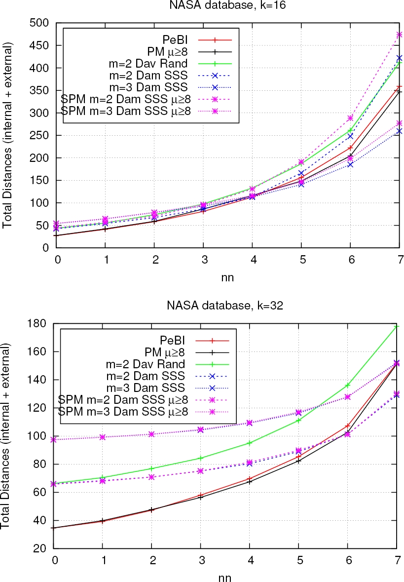 Fig. 4 Total distances computed for finding nearest neighbors as the number of nearest neighbors increase for the NASA database. The number of permutans is k=16 for the figure at the top, and k=32 for the figure at the bottom