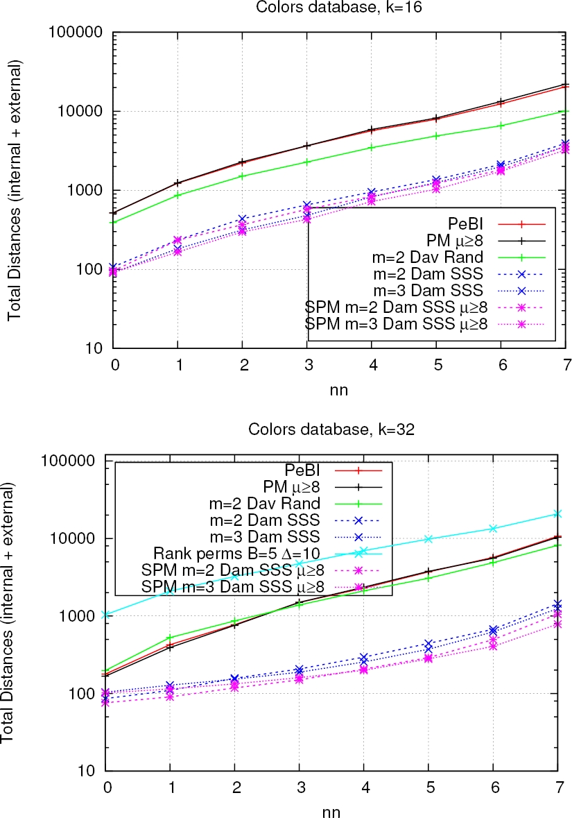 Fig. 5 Total distances computed for finding nearest neighbors as the number of nearest neighbors increase for the COLORS database. The number of permutans is k=16 for the figure at the top, and k=32 for the figure at the bottom