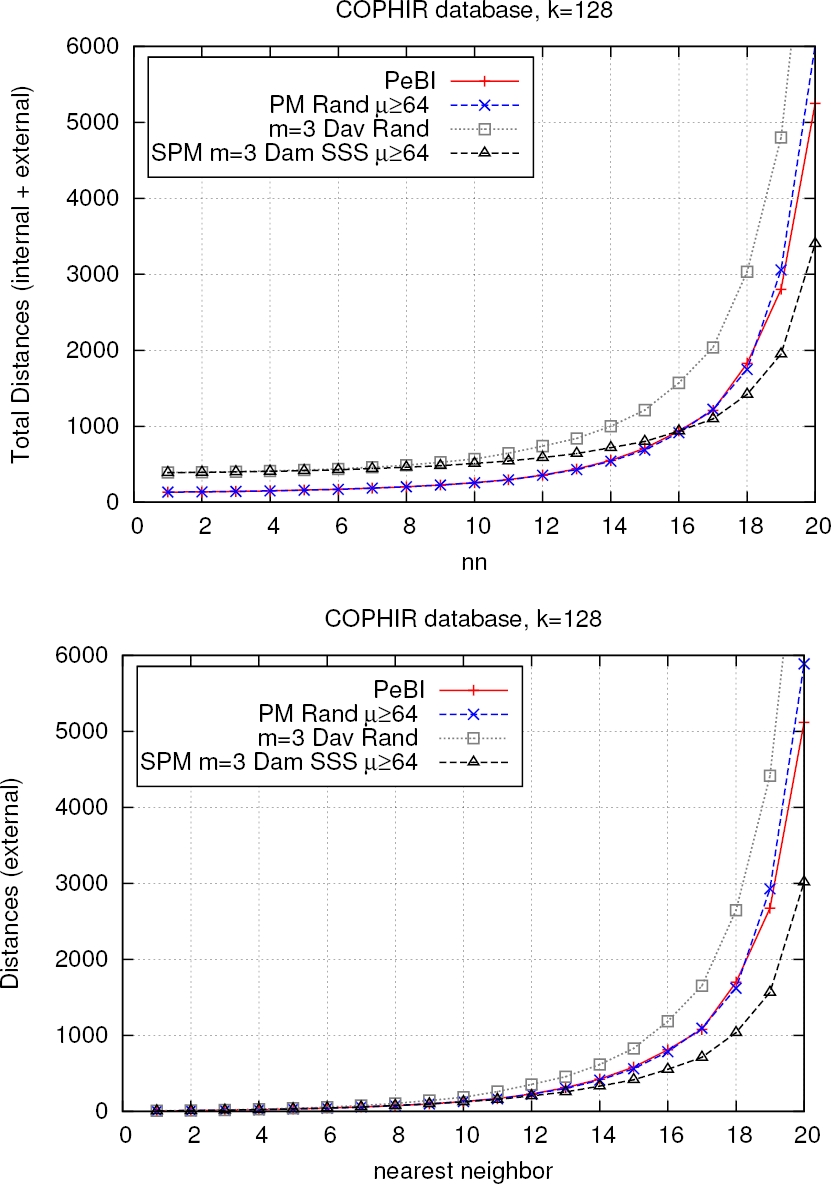 Fig. 6 Total distances computed for finding nearest neighbors as the number of nearest neighbors increase for the CoPhIR database using k=128 permutants, at the top the sum of internal and external distances, at the bottom just the externals