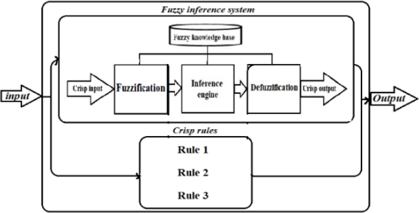 A FIS tries to formalize the reasoning of a set of rules of human language employing fuzzy logic [20-21]. The architecture of the FIS includes four components, these are Fuzzification, Knowledge base, Inference engine, and Defuzzification.