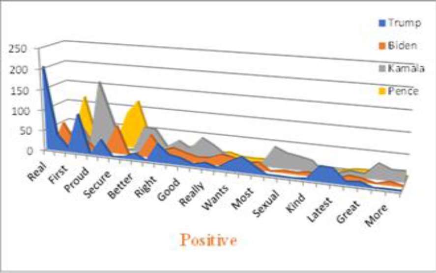 Positive feelings are responses that vary according to the individual opinion of each tweeter user. In Table 2, the concentration of positive feelings of the four candidates is shown and in Fig. 2, the graph of praise as positive feelings to the candidates is observed. positive sentiments. Kamala has 939 accolades followed by Trump with 676.