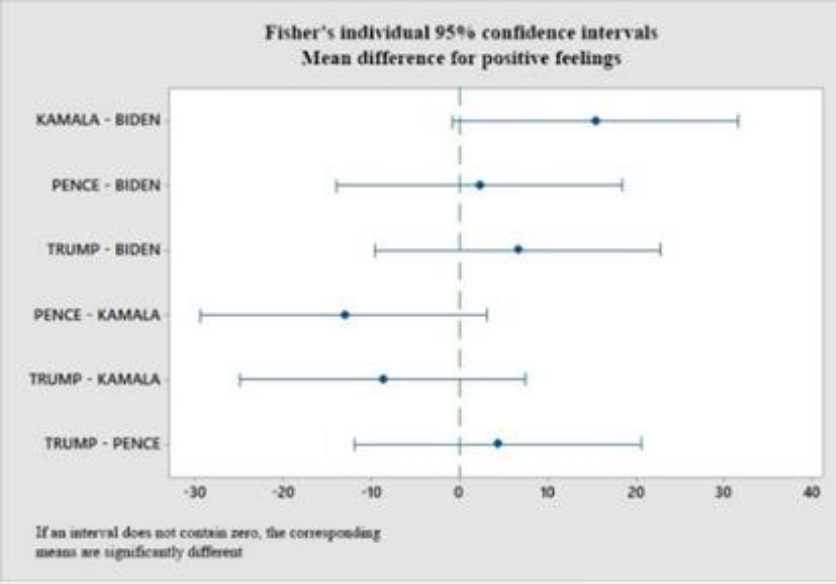 According to Table 3, where the averages and standard deviations for positive feelings were concentrated, it is assumed that the means are very similar for the two pairs of candidates and the standard deviation (ST) between Kamala and Pence do not have significant differences.