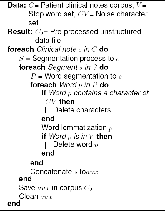 The goal of this unstructured data workflow is to obtain a tidy and numeric data representation of patient notes. In this workflow, Natural Language Processing techniques are considered.The first step is text pre-processing in order to prepare each clinical note into a standardized text representation for posterior manipulation. Algorithm 2 shows this step.