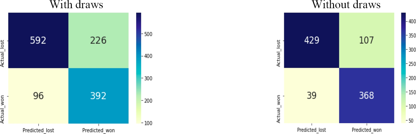 According to those confusion matrixes showed in figure 6 the accuracy performances without draws is 84% and 74 % with draws in the best of the cases. Table 5 shows a comparison of the accuracy obtained with the different algorithms with and without ties.