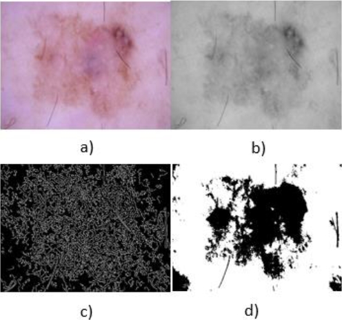 Fig. 1 Operations performed on the images. (a) original image; (b) grayscale image; (c) canny operator; (d) binarized image