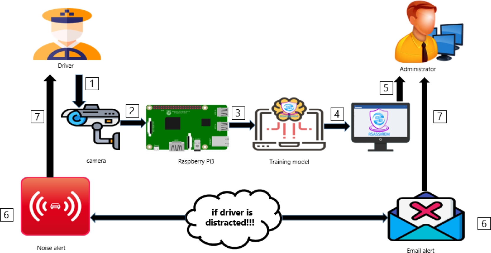 The whole proposal can be summarized as follows: a posture image is first captured, and then the image is processed to detect all the movements of the driver. According to the safe state image, if any change is observed that leads to distraction, a real-time alert is made to the driver using the alarm to get his attention while driving.