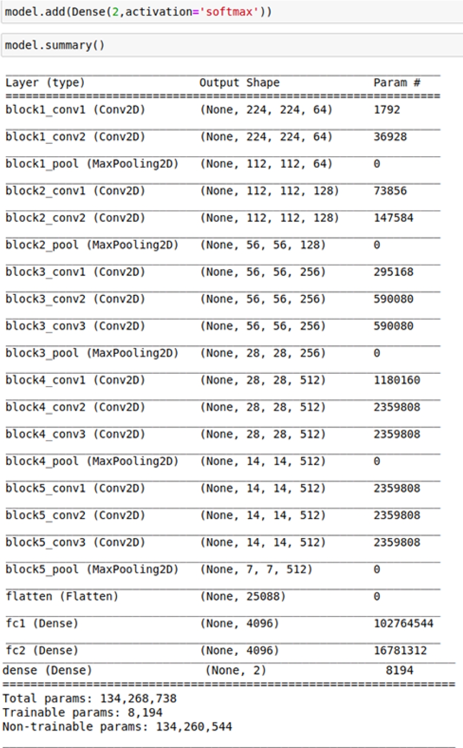 We complete the construction of the VGG16 model by removing the last dense which involves 1000 categories, we take two categories as example.