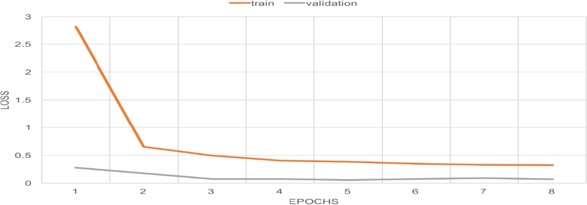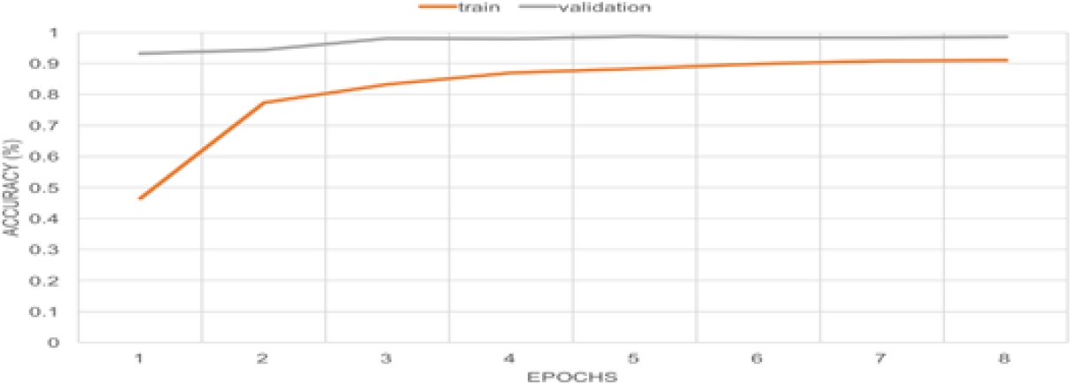 The training and validation accuracy gradually increase over the epochs in Figure 6 until they reach a certain threshold, indicating that no further improvements are made and leading to the end of training. Similarly, in Figure 5 the loss of validation and training decreases as the model learns, until it finally ends when the model begins to over-fit.