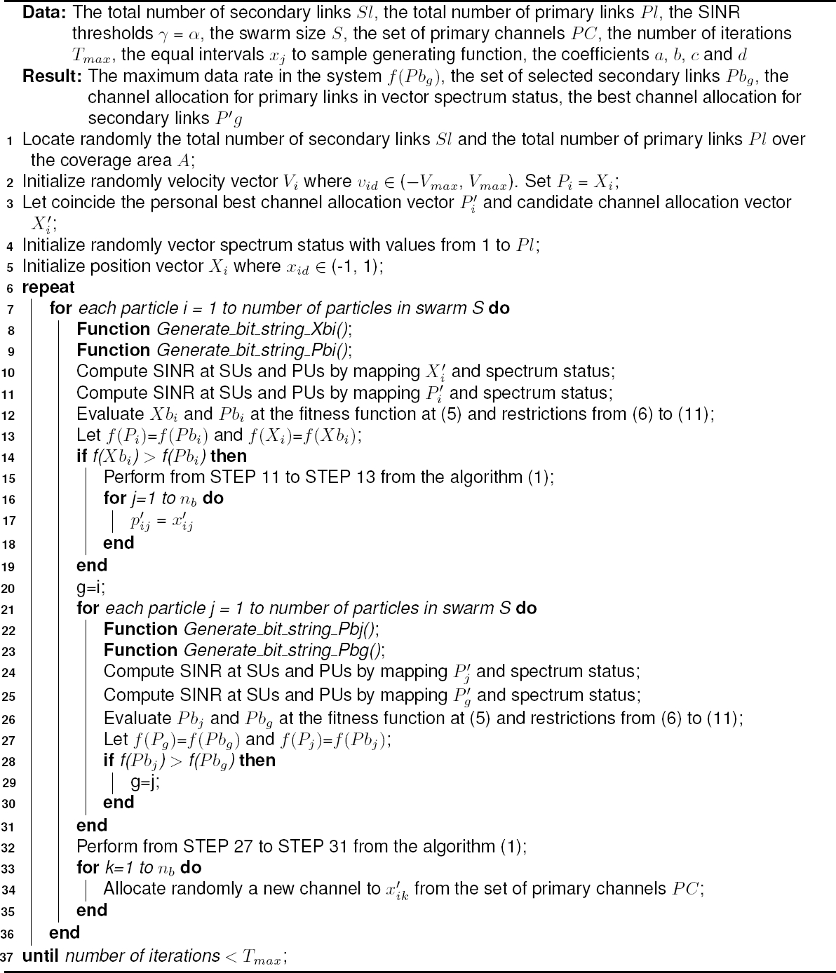 Those SINR levels are calculated by using equations (1) and (2). In STEP 12, if SINR restrictions in equations (6) - (7) are achieved for SUs and PUs,