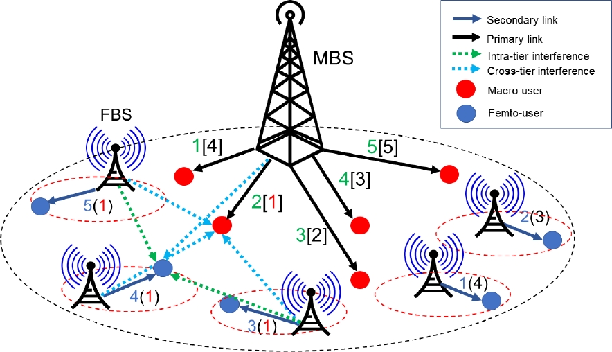Fig. 1 is the down-link scenario considered in this work. It is a HetNet where femto-cells (the red dashed circles) exist within the coverage area A of a macrocell (the black dashed circle). The macrocell has a macro-base station (MBS) which communicates with its associated macro-users (PUs). Consequently, the union of a transmitter, i.e. an MBS, and a receiver (a macro-user) is referred to as a primary link. In Fig. 1, the primary links are the black arrows; each primary link is identified by a number beside the link (the green numbers). Also, each primary link has a primary channel assigned (the number in brackets). The total number of primary links in